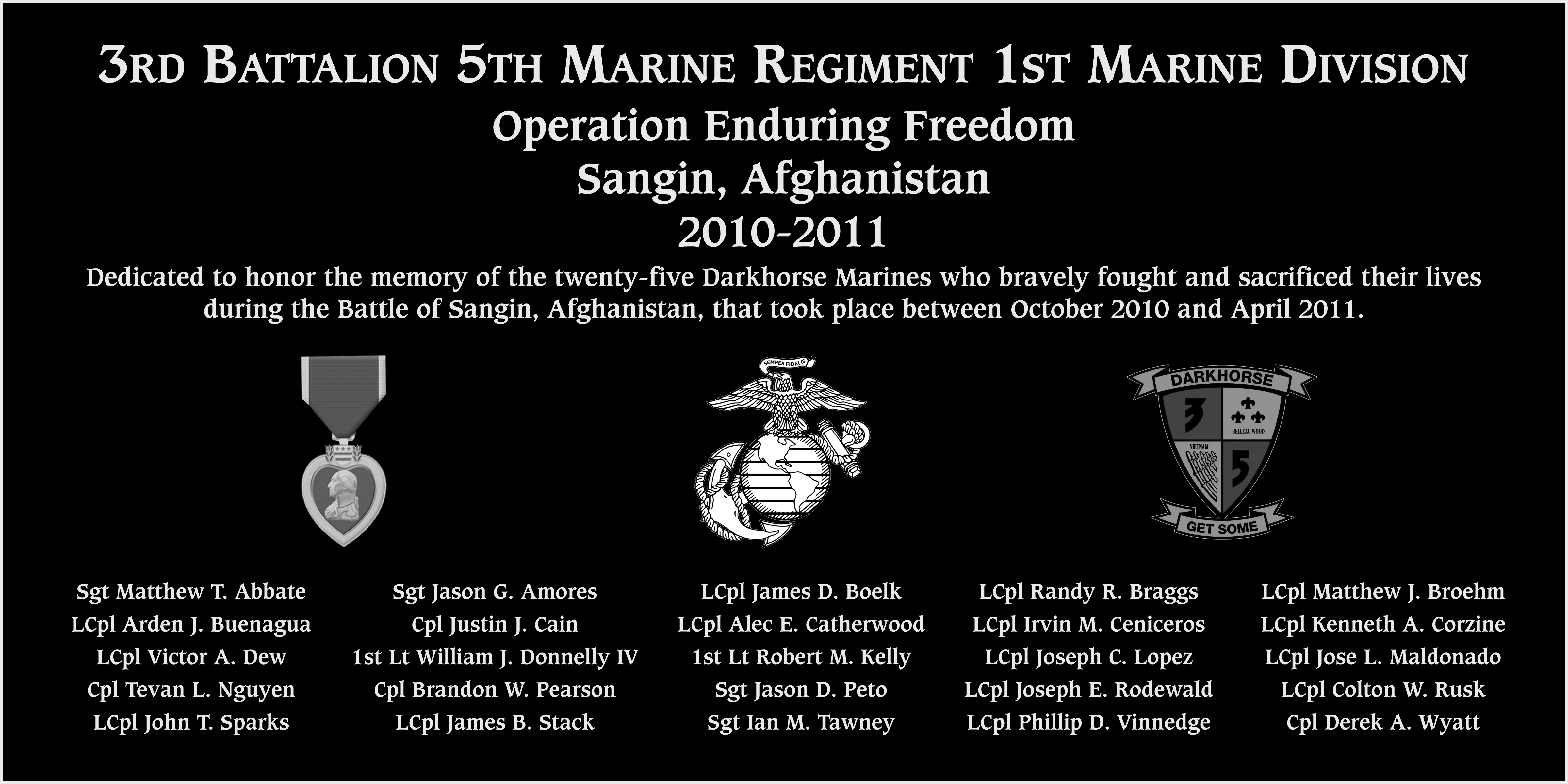 Dedicated to honor the memory of the twenty-five Darkhorse Marines who bravely fought and sacrificed their lives during the Battles of Sangin, Afghanistan, that took place between October 2010 and April 2011.
