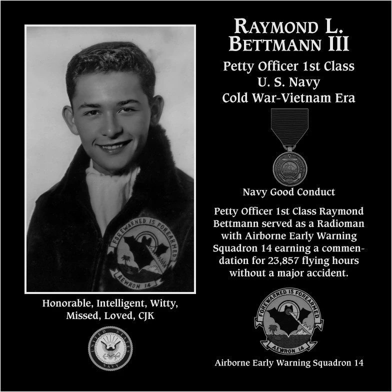 Radioman First Class Raymond Bettmann served as a radioman with Airborn Early Warning Squadron 14 earning a commendation for 23,857 flying hours withour a major accident.