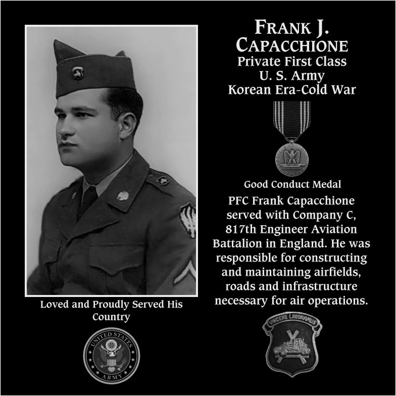 PFC Frank J. Capaccione served with Company C, 817th Engineer Aviation Battalion in England working on airfields, roads and infrastructure necessary for air operations.