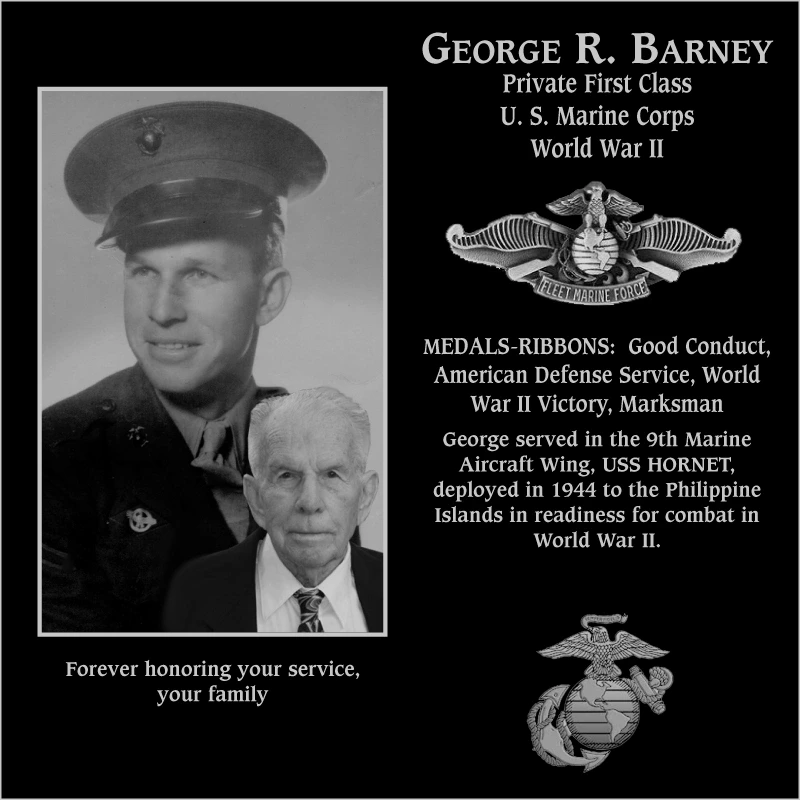 George served in the 9th Marine Aircraft Wing aboard USS HORNET (CV-12) deployed in 1944 to the Philippine Islands in readiness for combat in World War II.